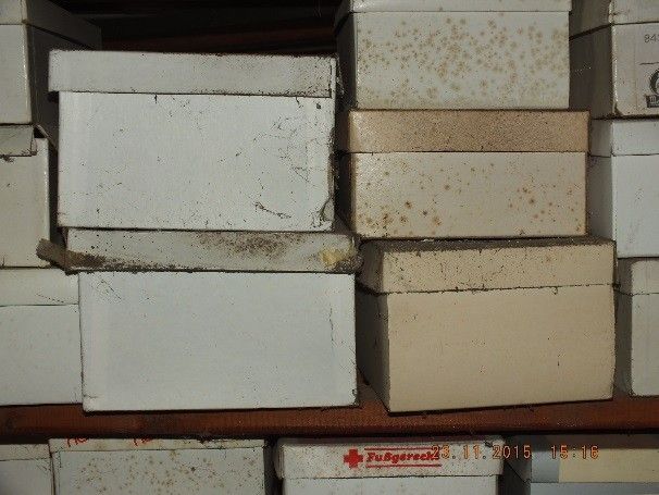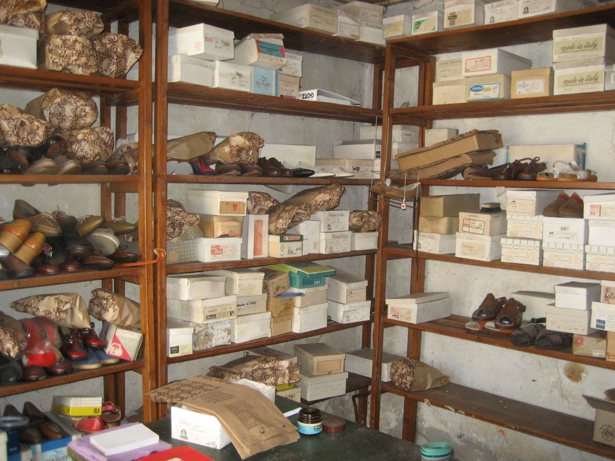 Inventar: Lattenregale mit Schuhschachteln; Verkaufstheke
