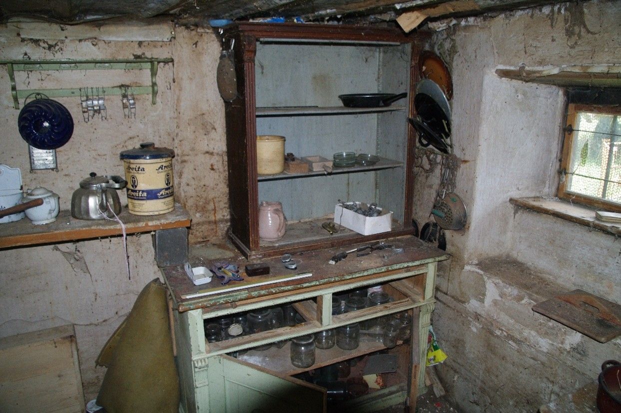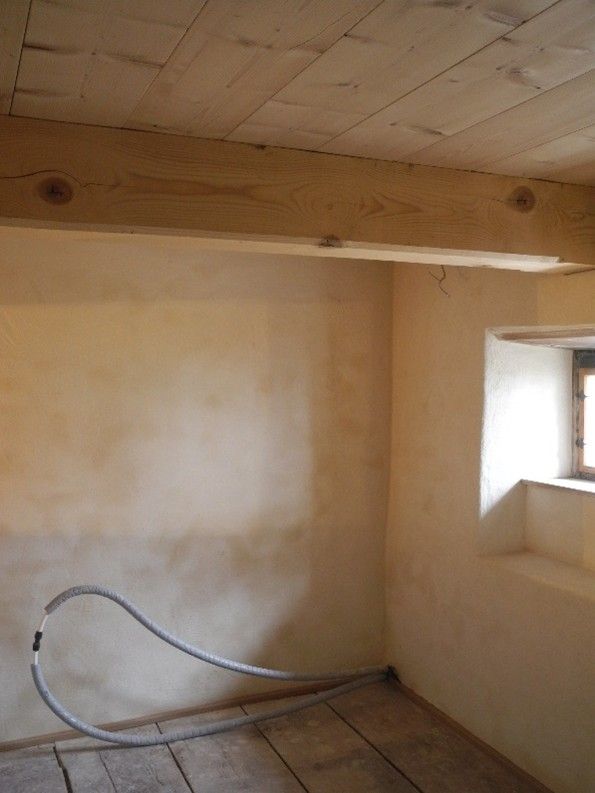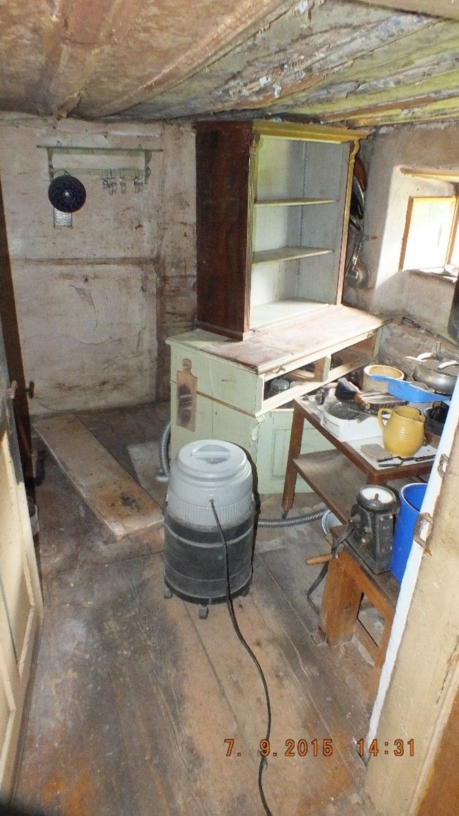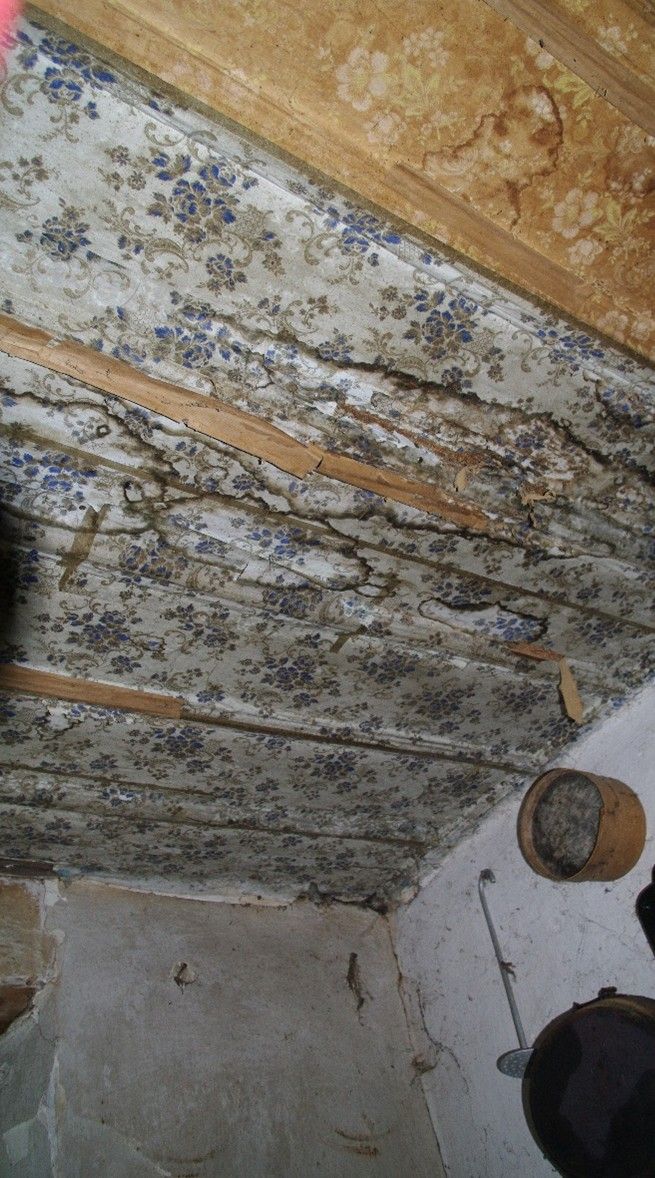 Decke: Brett-Leisten-Schalung unterhalb der Deckenbalken, mit Tapete verkleidet (um Staub aus der Darüberliegenden Tenne abzuhalten); Tapete brüchig.
