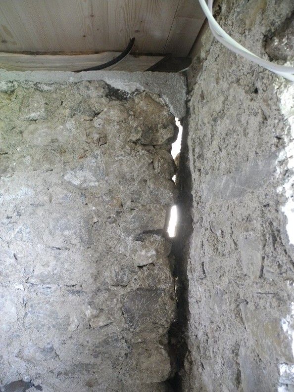 Mauerwerk: Bruchsteinmauer verputzt, mehrere teils abblätternde und abgeblätterte weiße Anstriche und Putzschichten. mehrere cm breiter Spalt
