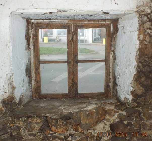 Mauerwerk: Putz z.T. nicht mehr vorhanden; Im Bereich des Fensters brüchig