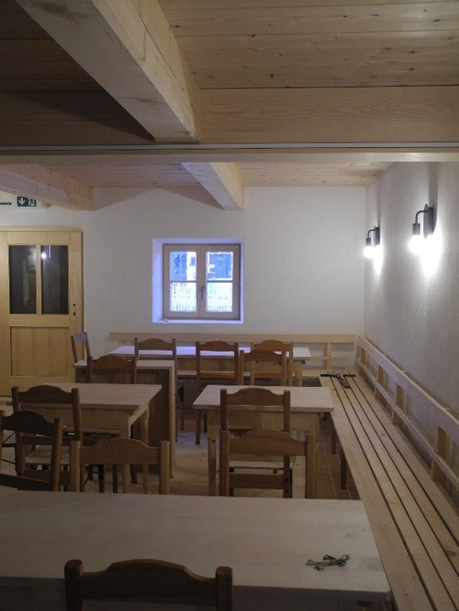 Verlegen Fußboden aus Tannenholz (Holz aus Stadtwald Bad Tölz, Verarbeitet zu Fußbodendielen durch Schreinerei Franz Oswald, Gaißach) unter Mithilfe des Vereins (Hans Mayr und Max Leutenbauer). Die Herstellung der Fußbodendielen wurde von der Schreinerei Oswald gespendet.