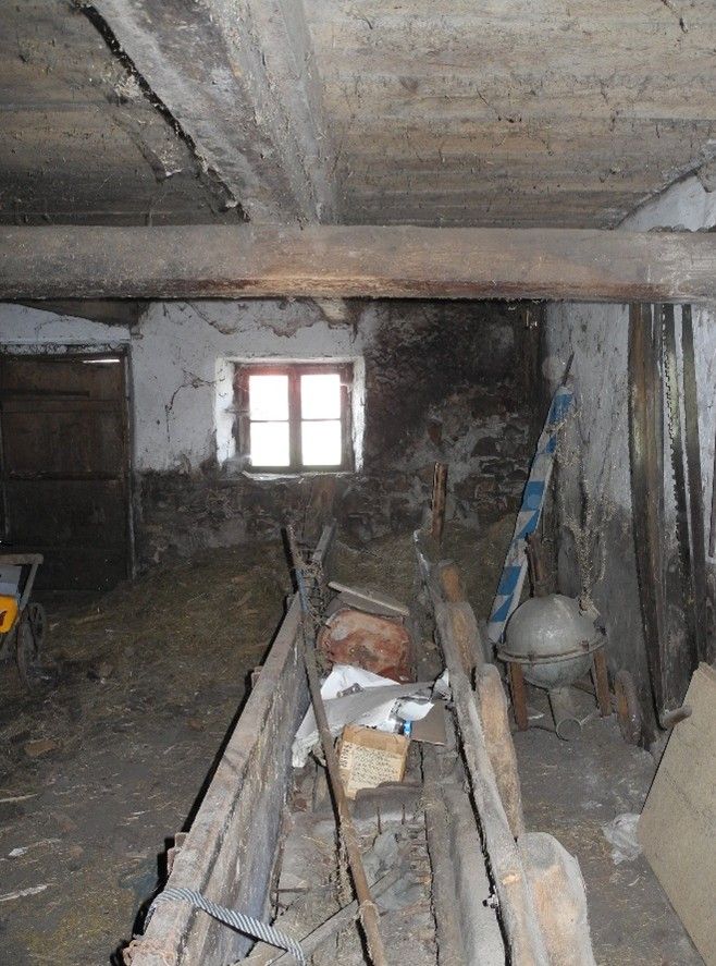 Fußboden: durch mechanische Beanspruchung z.T. auf wenige Millimeter abgenutzt; Anobienbefall; Fragmente mehrer Fußbodenlagen vorhanden