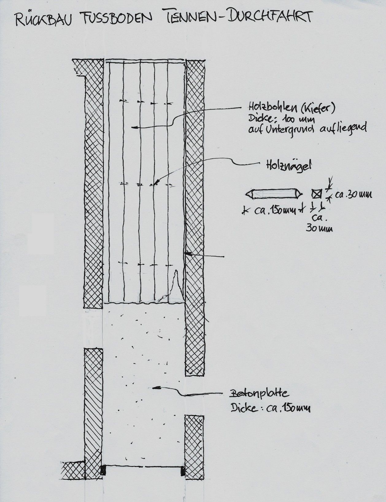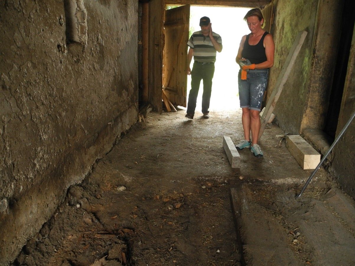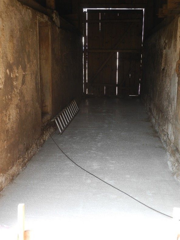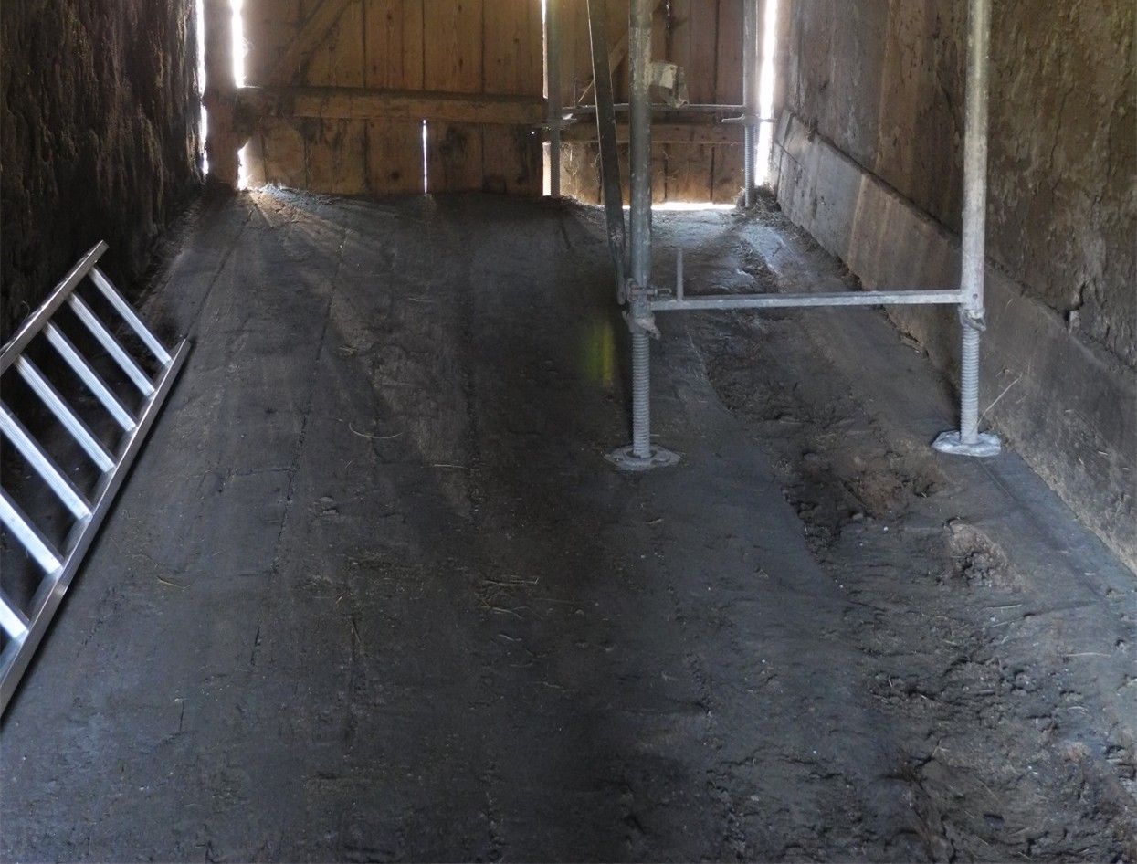 Fußboden aus ursprünglich ca. 10 cm dicken Bohlen durch mechanische Beanspruchung teilweise bis auf wenige Millimeter stark abgenutzt. Im Bereich der Ausfahrt zum Garten betonierte Betonplatte