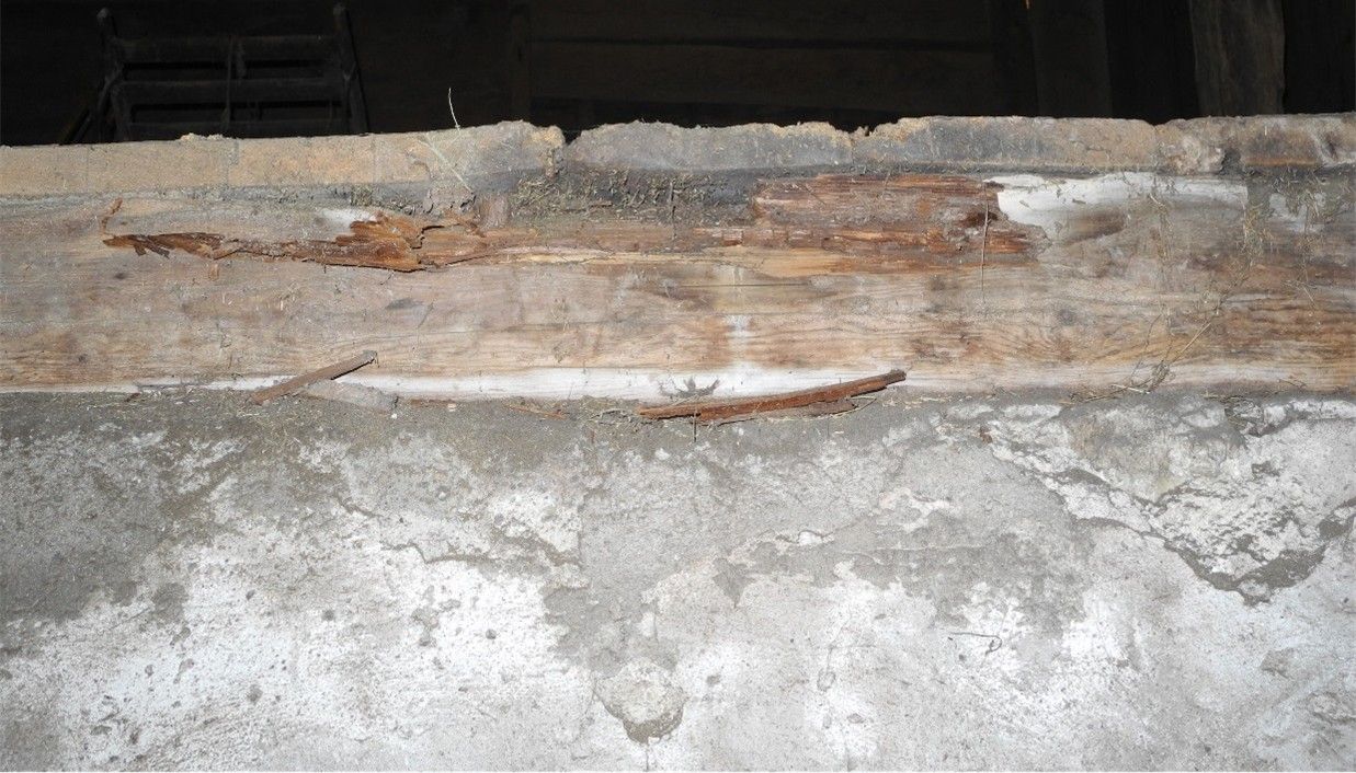 Mauerbalken, der zur Auflage der Stalldecke dient, mit z.T. starken Fäulnisschäden
